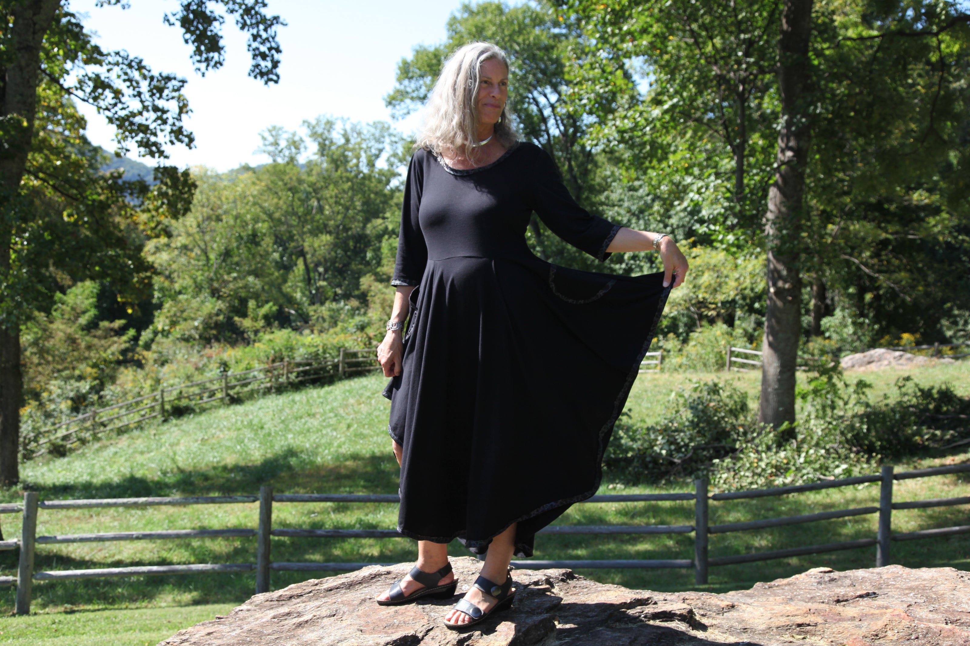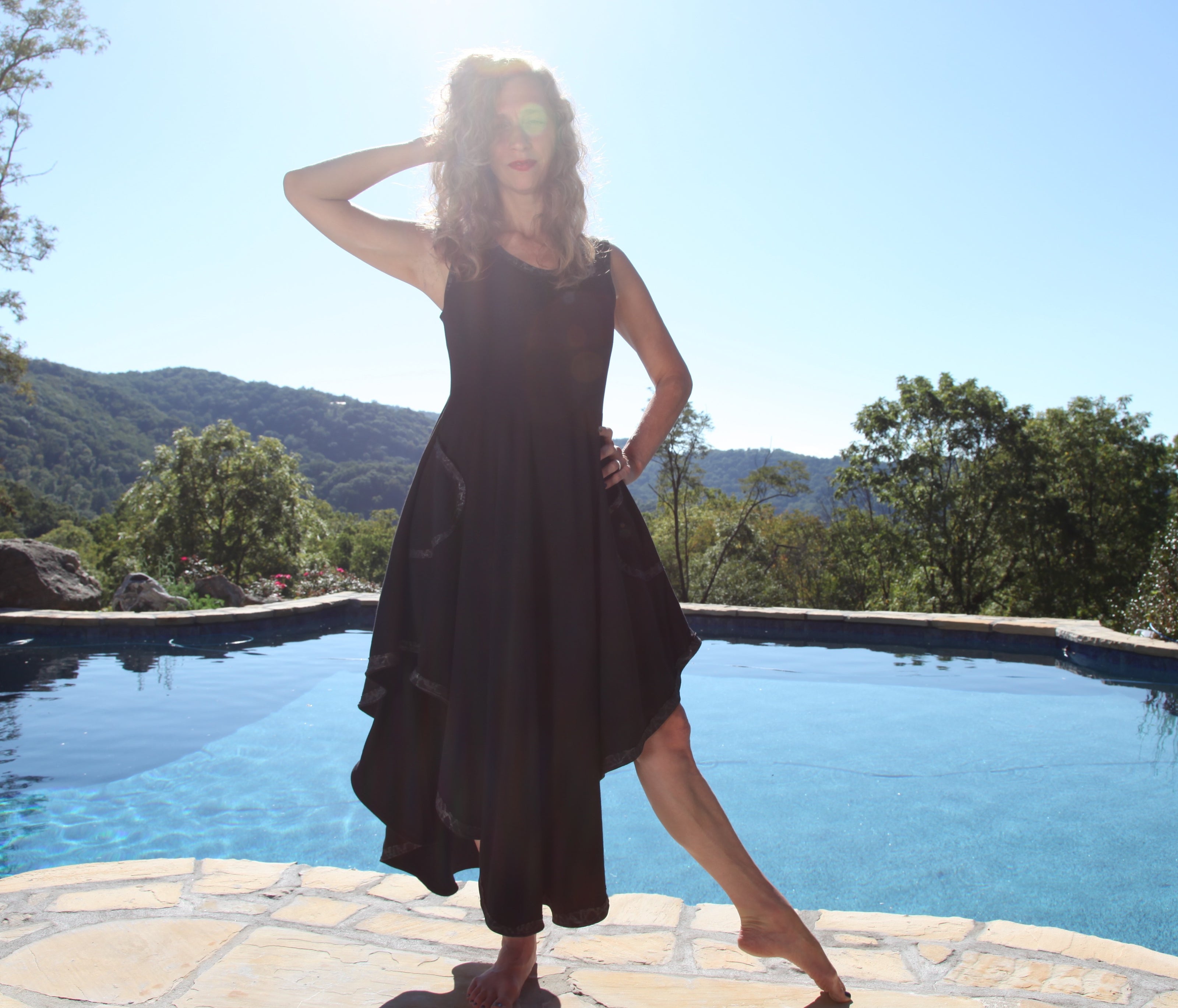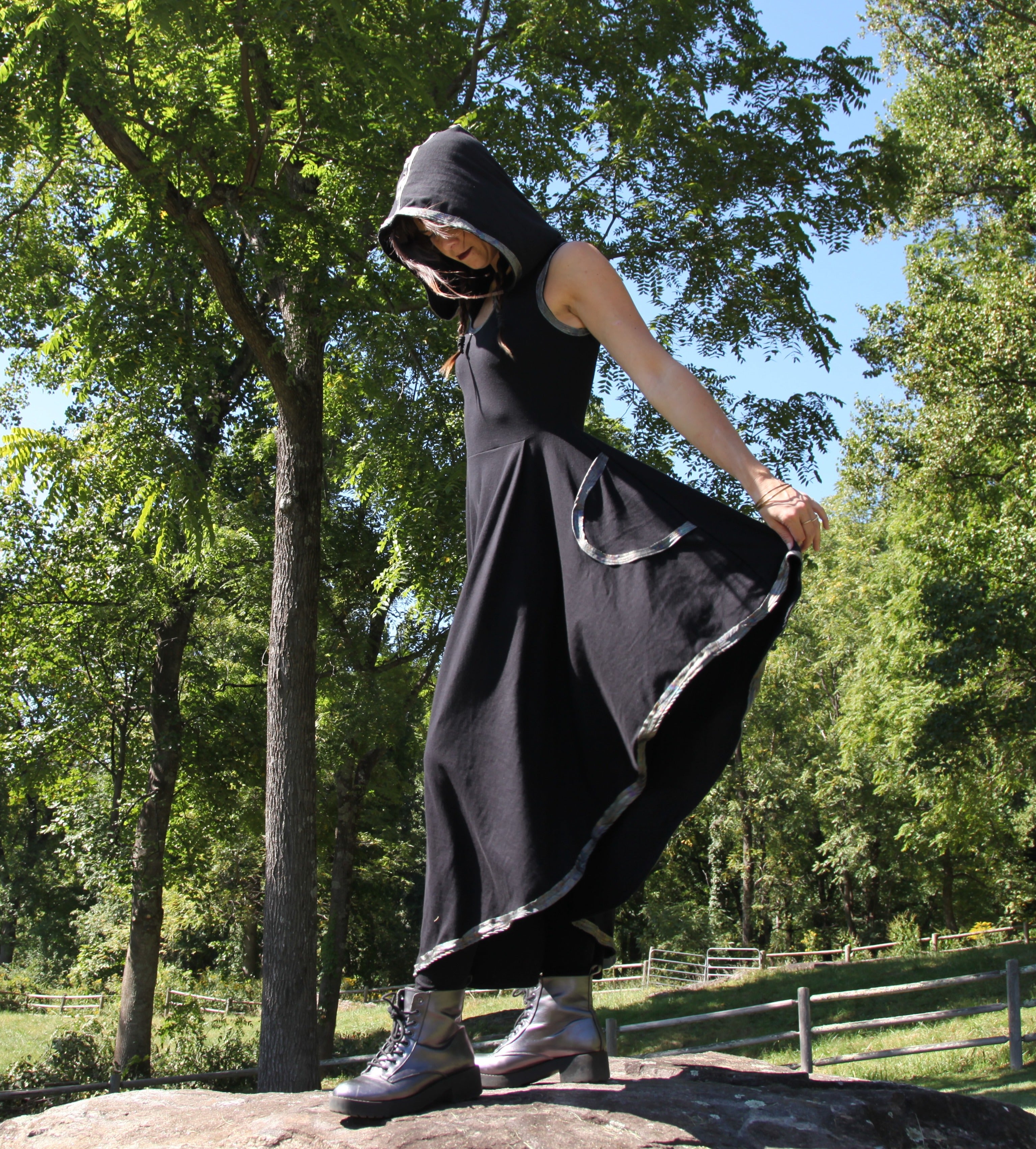 Elevate your style with Daily Threads, the little black dress, redefined. We are lifted by how we feel in a dress that spins perfectly around our whirling bodies. A versatile wardrobe staple that you can dress up or dress down for any occasion, these are available as sleeveless or with three-quarter-length sleeves, in an above-the-knee hemline or a long cascading curved hemline, with or without cosmic, holographic, reflective snakeskin trim, and with or without a hood. Crafted from premium, locally-sourced organic cotton, these dresses embody both sustainability and elegance. Flowing silhouettes in luxuriously-soft fabric drape gracefully on women of all ages. Daily Threads are the perfect timeless adornment.