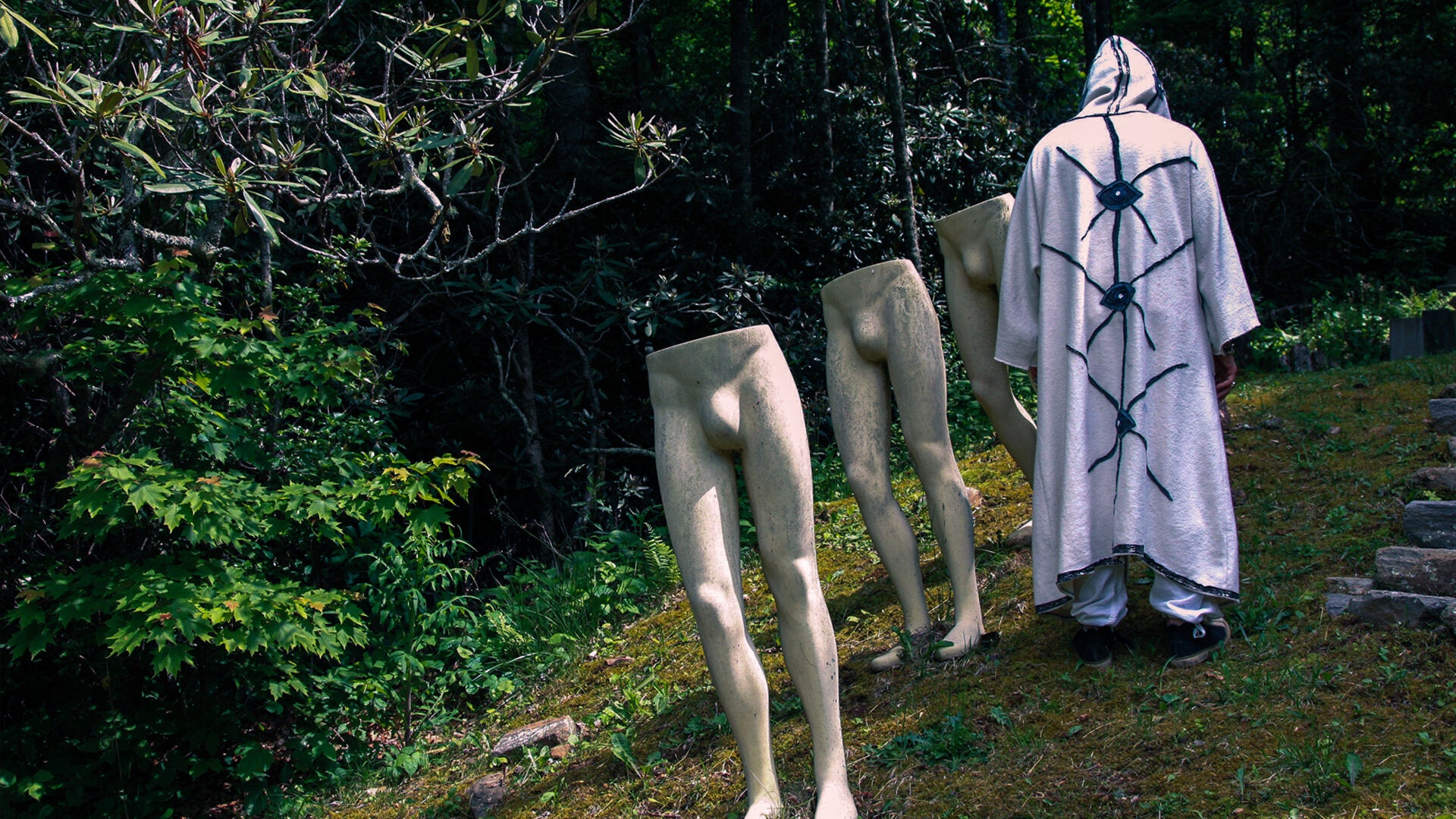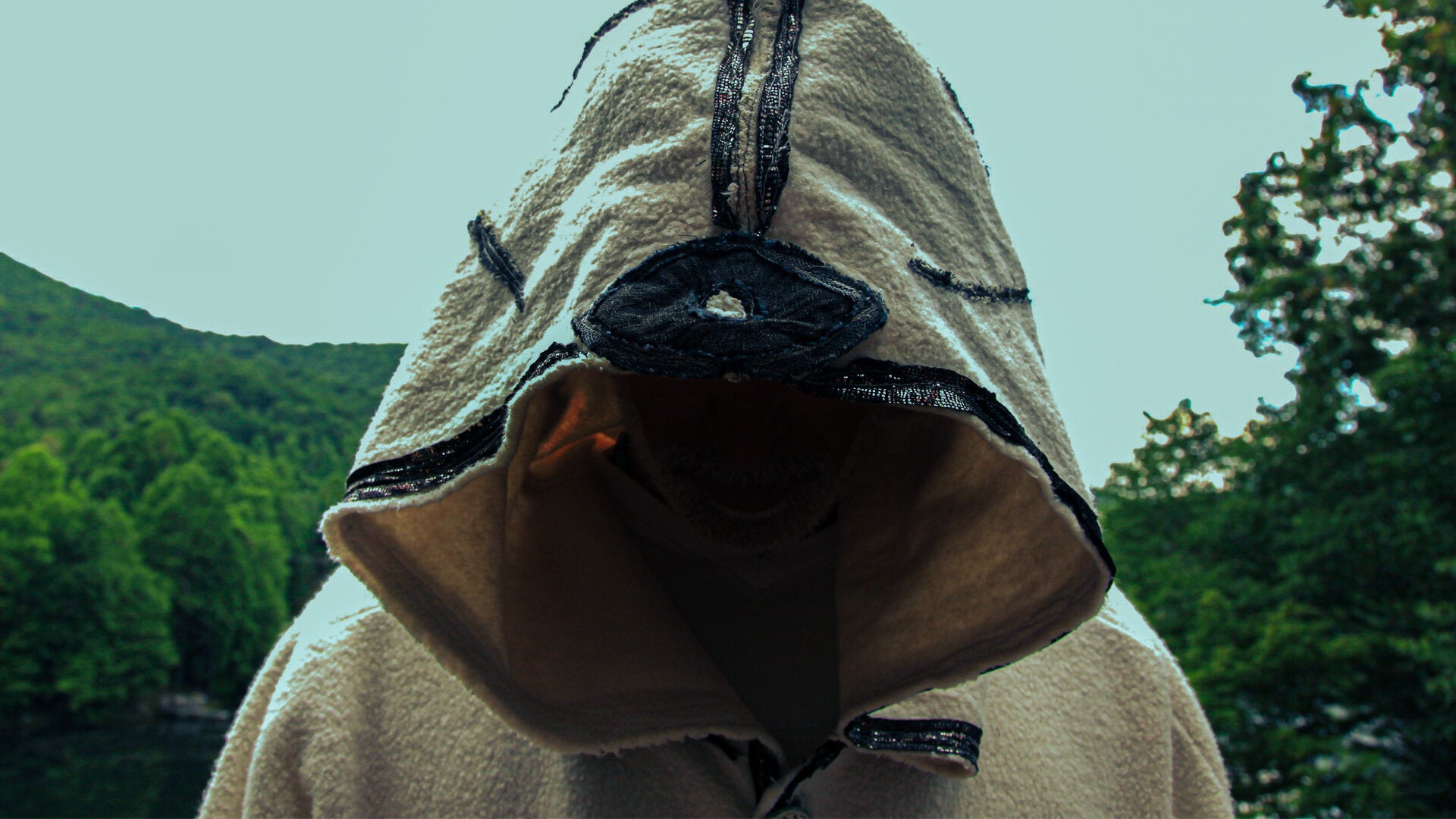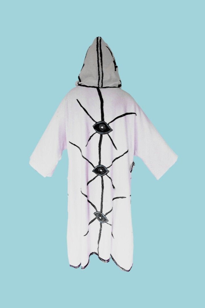 This cloak was created using locally milled organic cotton fleece. The eyes were constructed from an old tie that belonged to David’s father, along with other fabrics that had been used for his wife’s dresses and some antique lace from her grandmother. The button is glass.