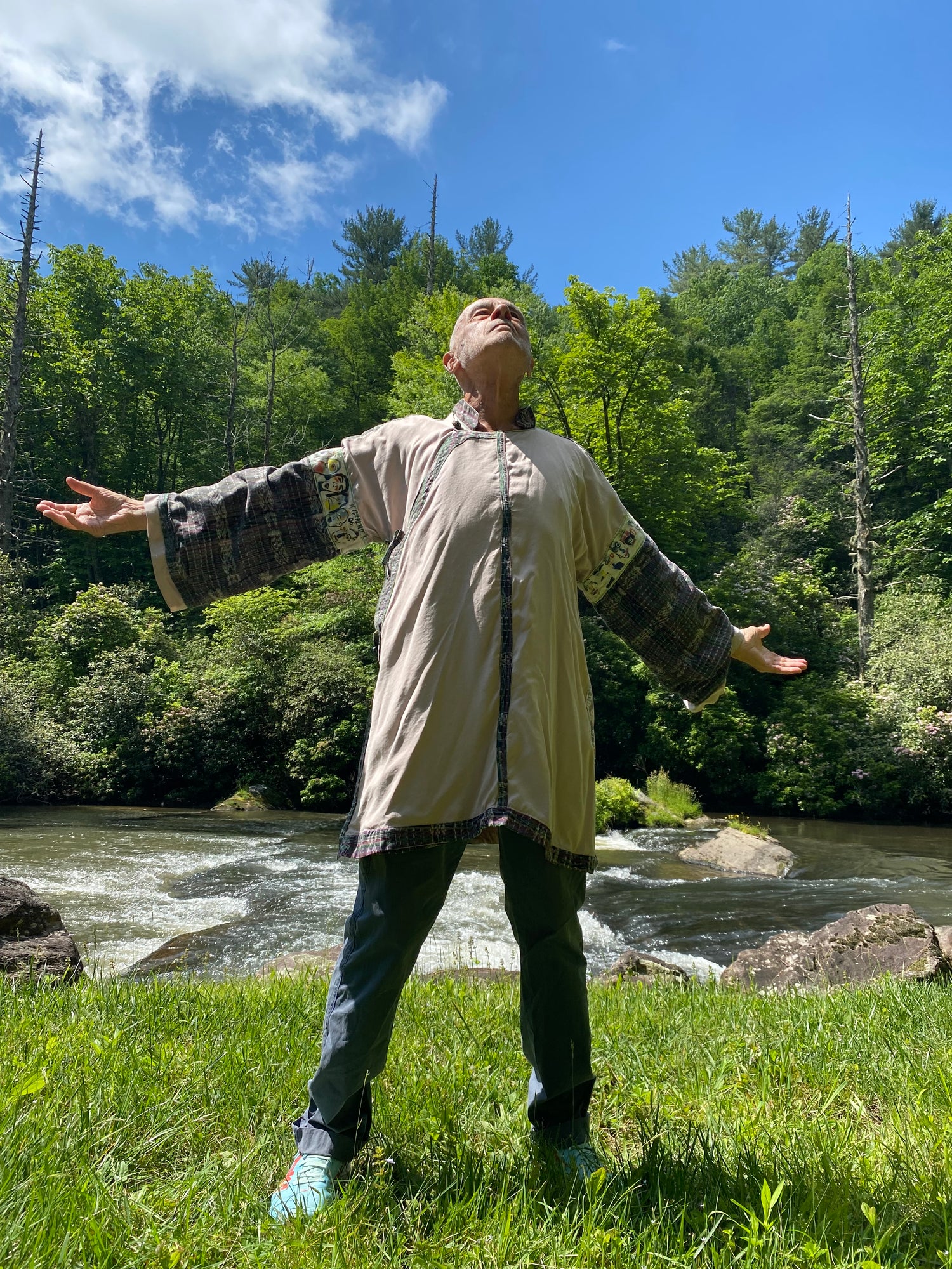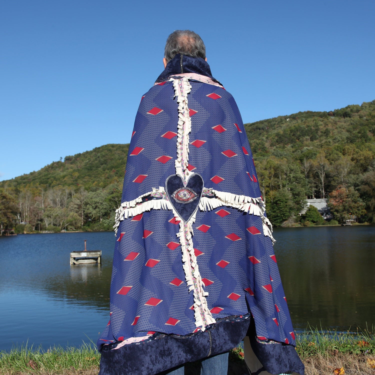 A Story Cloak, also known as a storytelling cloak, is a unique, custom-made garment that embodies your personal narrative and family history through carefully-chosen fabrics, vintage materials, and meaningful symbols. Each storytelling cloak is handcrafted to reflect the wearer's individual journey, creating a wearable piece of art that connects you to your ancestors and fosters personal transformation. This offers a way to connect your inner process and journey with a garment that anchors your healing process in your body.